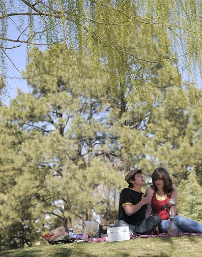 Student Roger Martines and Allisha Morath smoke hookah at the Duck Pond. "We decided to come out and have a picnic, topping it off with a little hookah," Martines said.