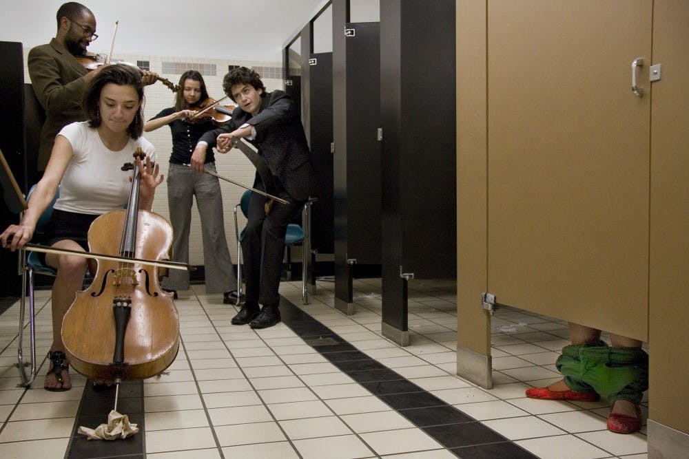 A student string quartet plays in the bathroom and takes requests. The students said they get six bonus credit hours per semester for playing in the bathroom every day.