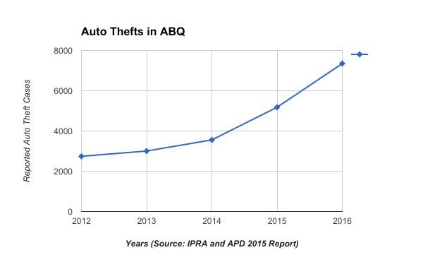 The Albuquerque Police Department’s 2015 annual report indicates that an auto theft occurs every hour and 45 minutes.