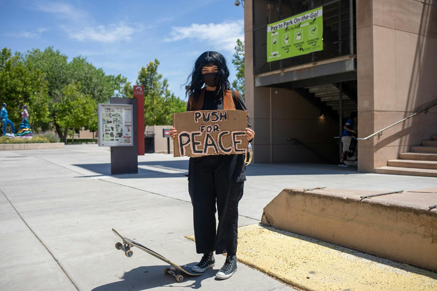 The protest, entitled “Push for Peace,” started with a voter registration drive at the University of New Mexico’s Smith Plaza and ended with a skate down Central Avenue to Civic Plaza.