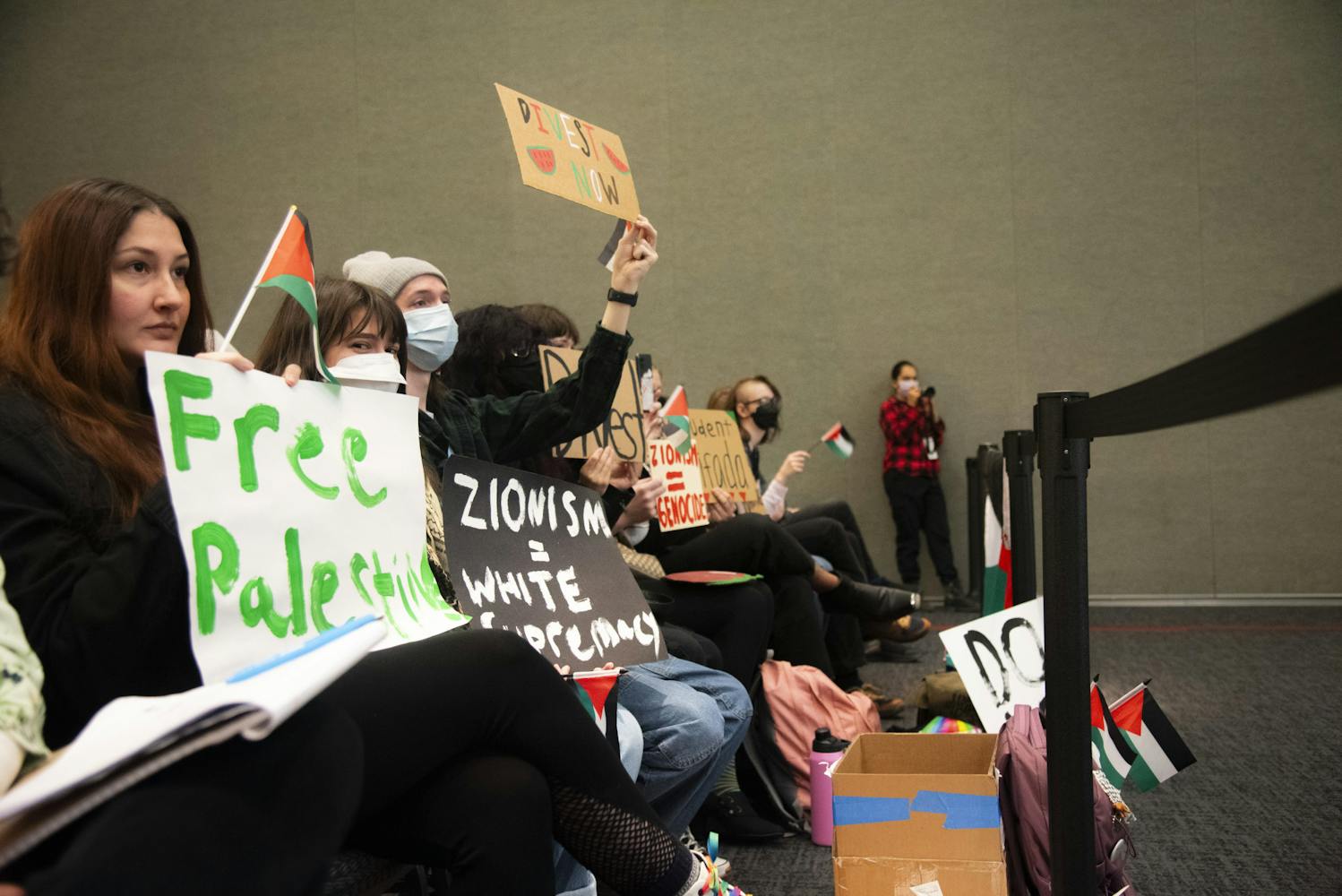 After the meeting ended, student protesters chanted “Whose school? Our school,” and “Disclose, divest, we will not stop, we will not rest,” as they left the meeting.