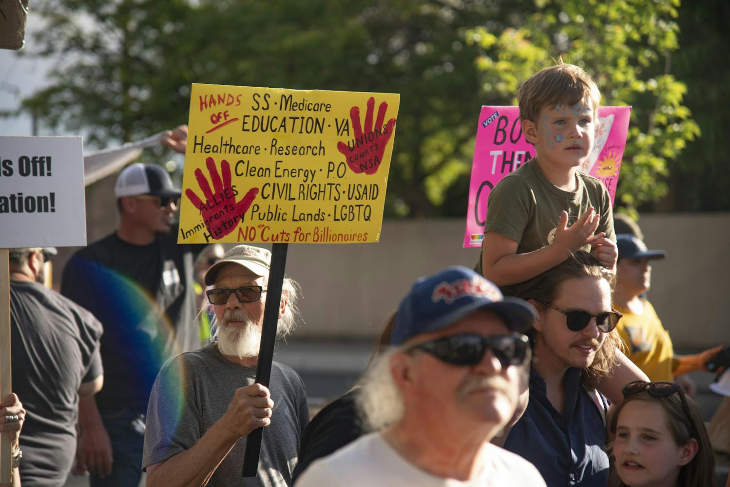 A section of the crowd carried a large banner that read, “Burque over billionaires,” with an illustration of a fist clenching a hammer. They chanted “Union power.”