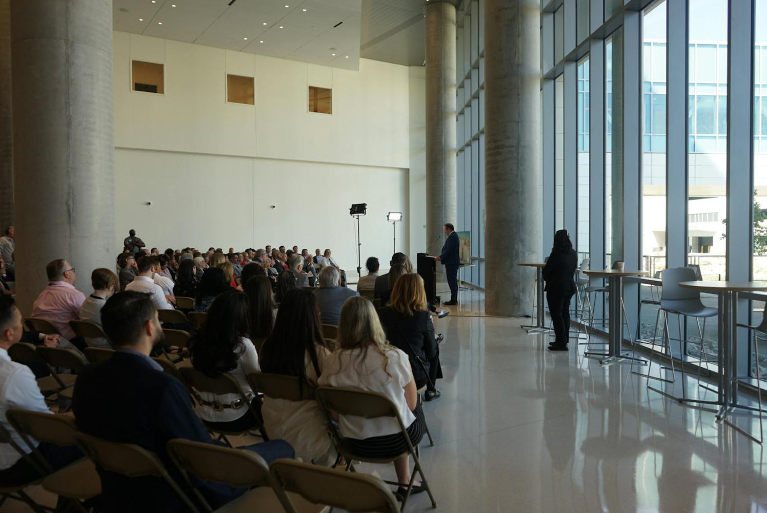 University President Garnett Stokes discussed the art adorning its building, the struggles faced in the design process with the many changes made, and the difficulties the hospitals faced during the COVID-19 pandemic.