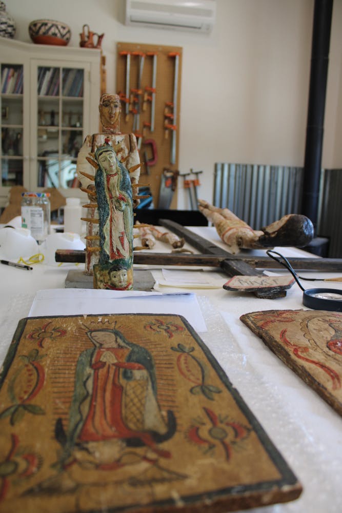 While participating in the Spanish Market each year, Goler become involved with the conservation of bultos and retablos in churches in New Mexico, helping to clean and take care of art pieces — so much so that his northern New Mexico studio is referred to as the “santo hospital” among the santeros and santeras of the community, he said.