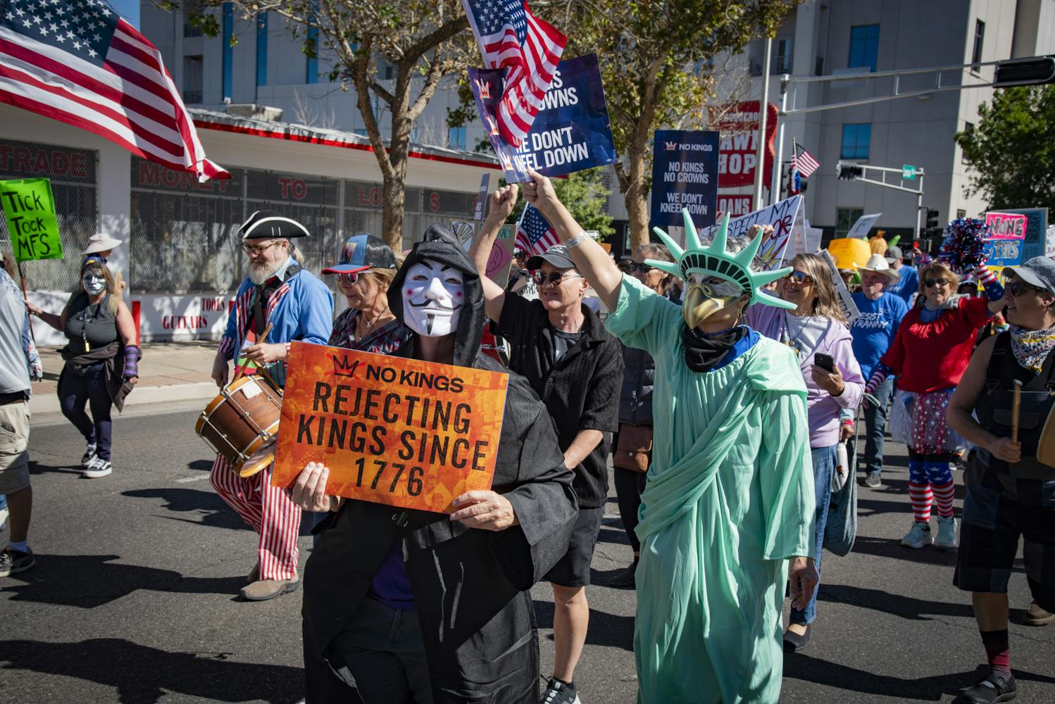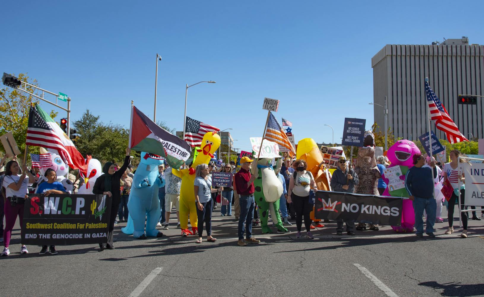Frogs, chickens, bananas, pigs, unicorns, axolotls and dinosaurs marched alongside several thousand people in the streets of Downtown Albuquerque during the nation-wide “No Kings” protest.