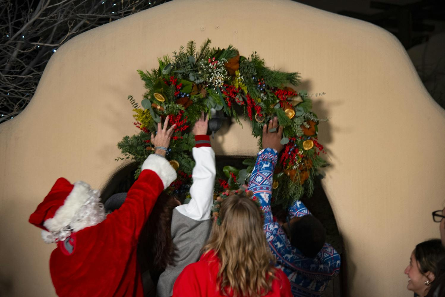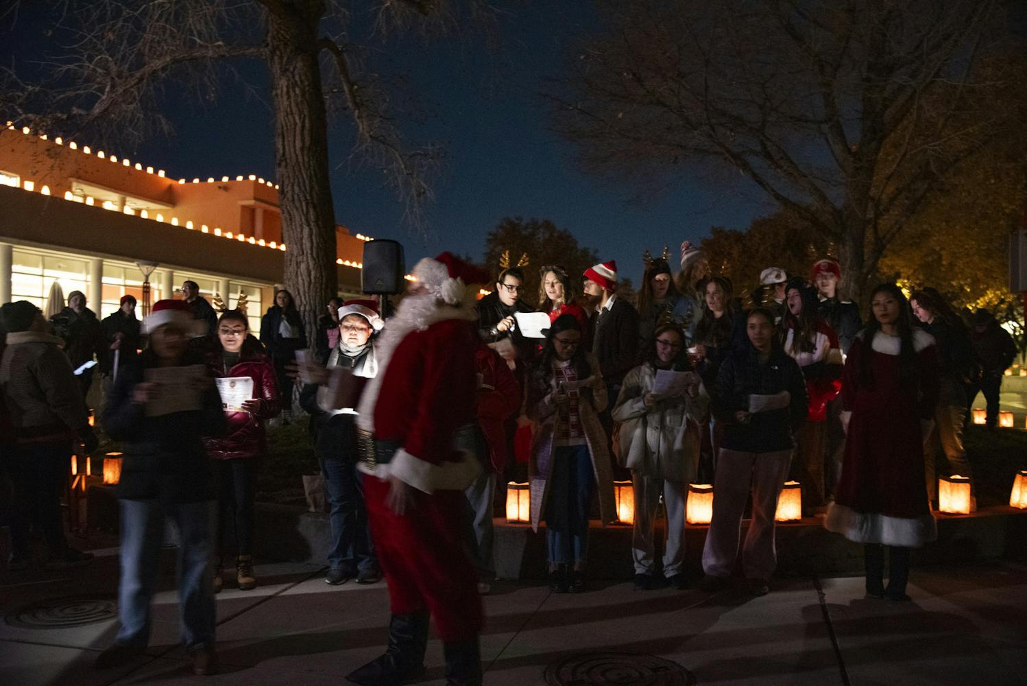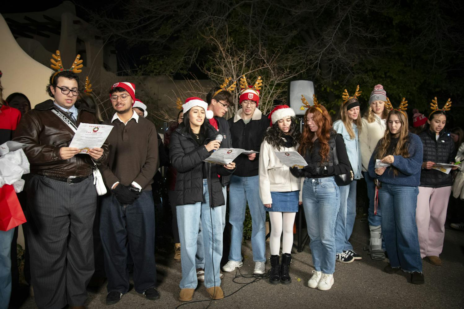 Following some sweet treats, the march to University House would begin. There were four stops with Christmas caroling, culminating with the hanging of the wreath, also known as “the Greens,” on the President’s residence. The first stop was outside the Cornell Parking Structure next to Popejoy Hall and the Fiestas Dancers statue. The singing started off well with classics: “We Wish You a Merry Christmas” and “Rudolph the Red-nosed Reindeer.” The singing was led by the President of Mortar Board Bree Hawkins, Vice President Tazz Jaber and a choir of students.