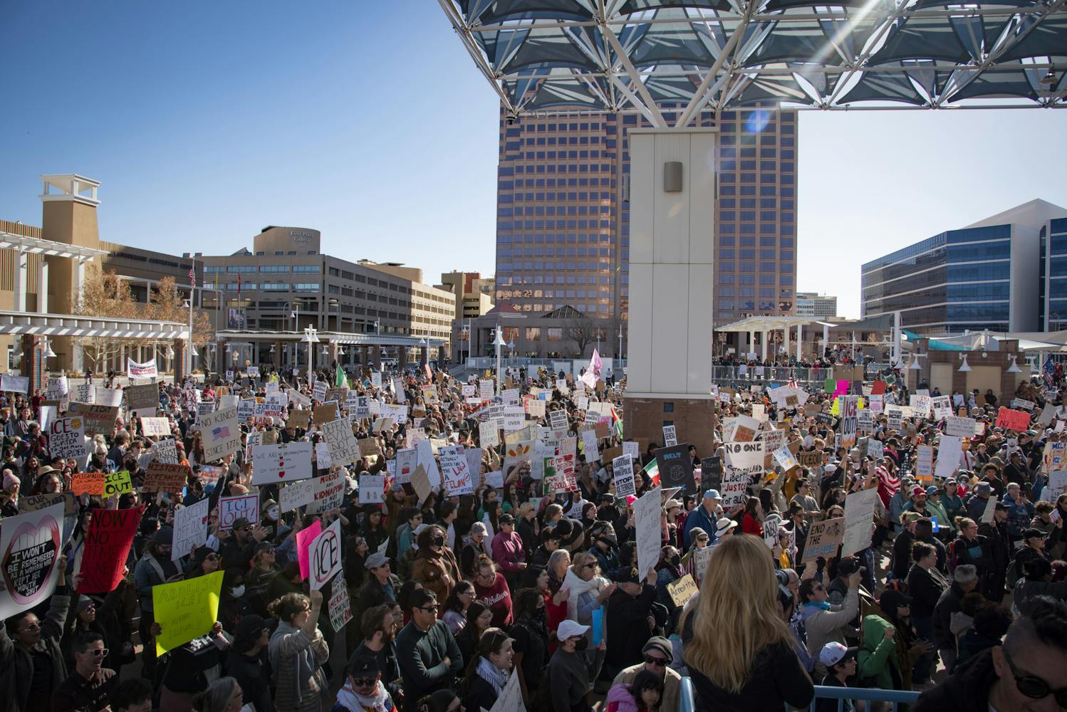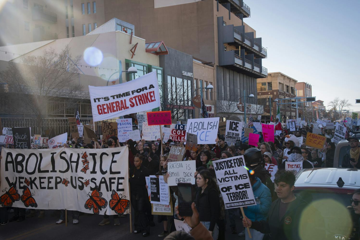 Thousands marched in Downtown Albuquerque on Friday, Jan. 30, to protest against President Donald Trump’s Administration and Immigration and Customs Enforcement during a nationwide strike that called for no school, work or shopping for the day.