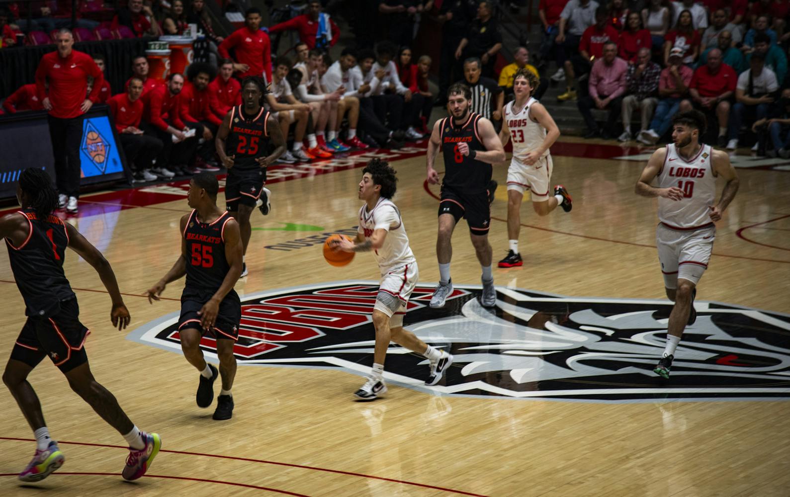 The game started off fast and furious. The Lobos came out with a purpose, scoring 16 points to take an early nine-point lead less than 4 minutes into the first half, though the Bearkats did not go away; they went on a 12-4 run to cut the deficit down to 8 points.