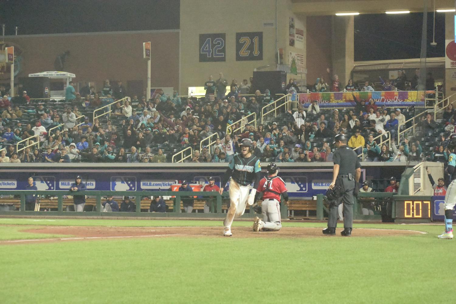Game two was a pitchers’ duel. The only run of the game came from the Aces in the top of the fifth inning, when right-fielder Kristian Robinson hit a fly ball to his counterpart, right-fielder Sterlin Thompson, who lost it in the lights, resulting in a triple. Aces second baseman Jacob Amaya promptly drove him in on a sacrifice fly. That moment held up as the game-winning swing, as it ended with the Aces up 1-0 — the first time since Memorial Day 2014 and the third time ever that a game ended 1-0 in Isotopes Park.