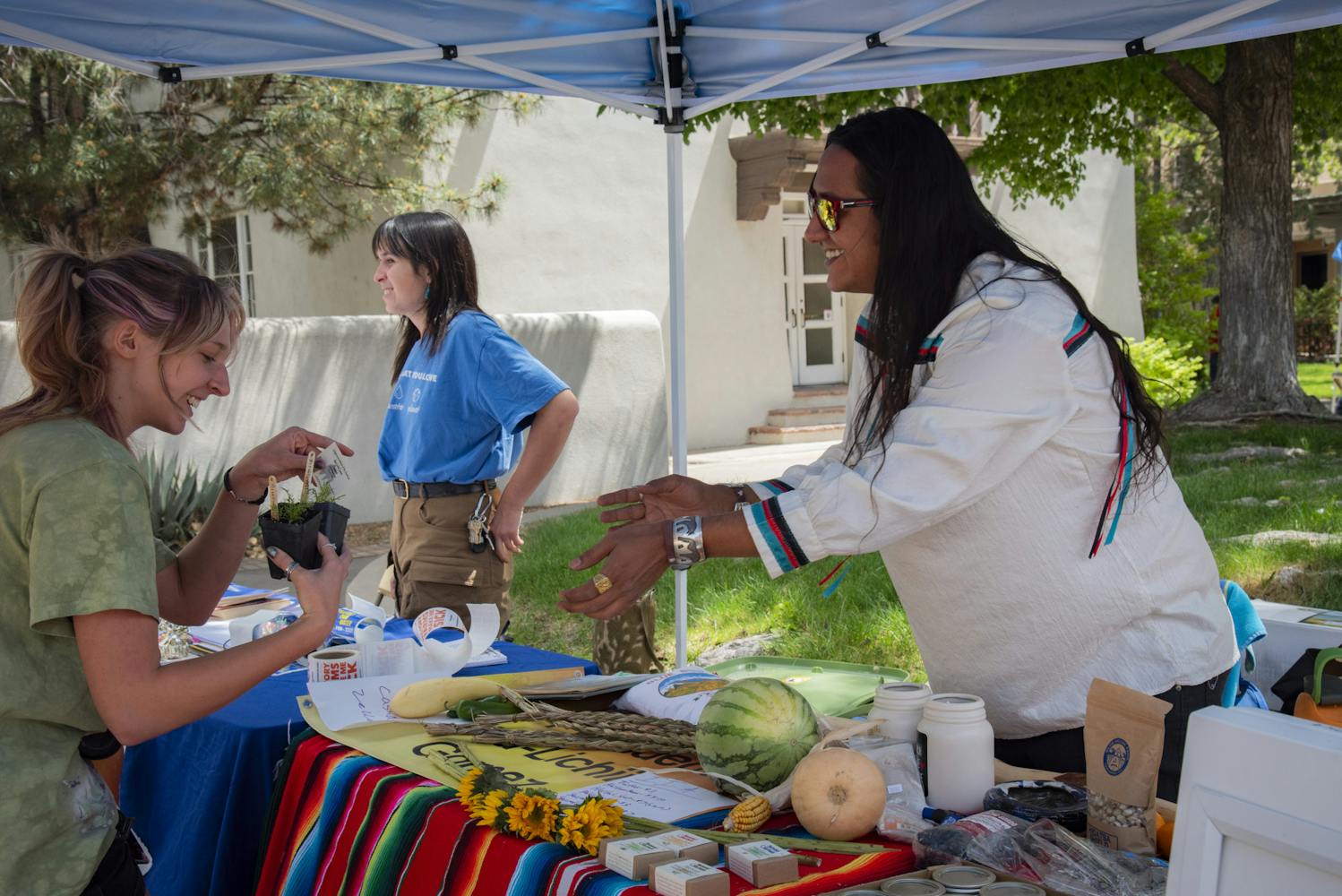 Indigenous Institute of the Americas President Itsa-Lichii Gomez tabled near Lobo Gardens, teaching visitors about regenerative agricultural methods that Indigenous people have been using for thousands of years.