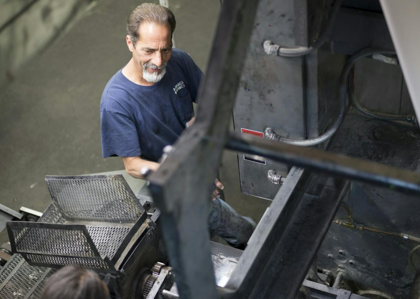 Vanguard Printing uses a letterpress-style printing press that is completely hands-on and has no computer oversight. During this process, pressmen Brent Sells and John Coates are constantly on the move, checking for focus, alignment and color balances.