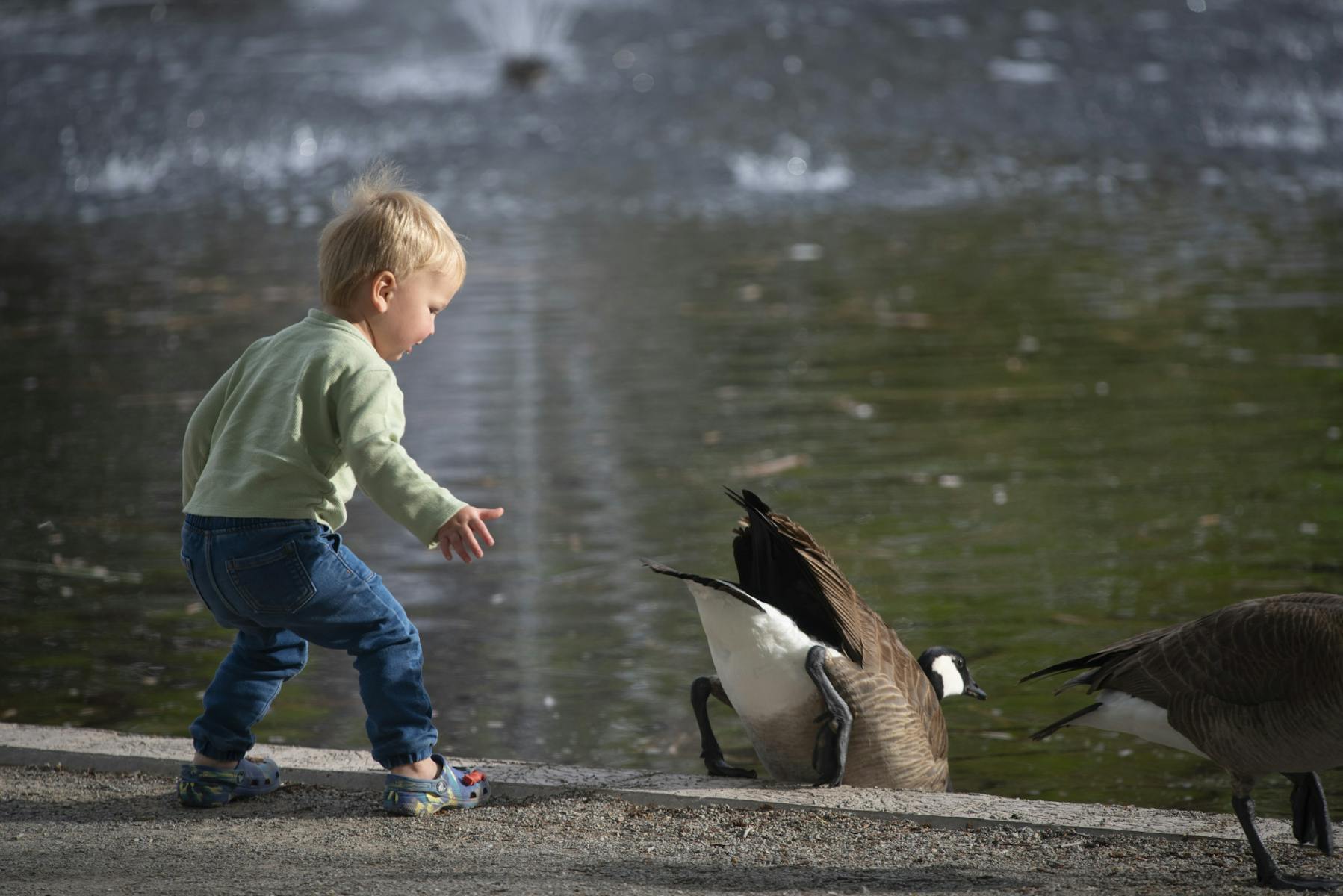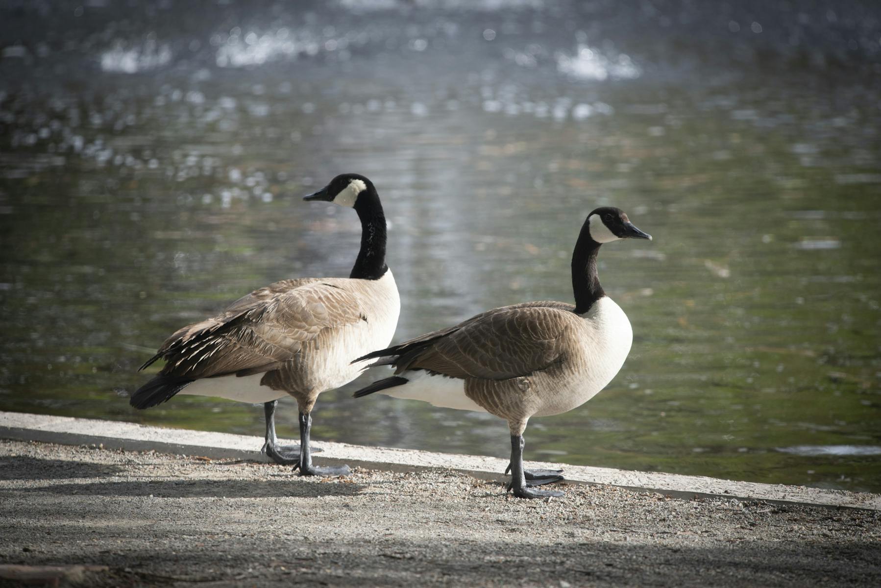 The geese, showing no fear of the students, walked casually to the shore of the pond where they were startled by a small child who tried to pet them.