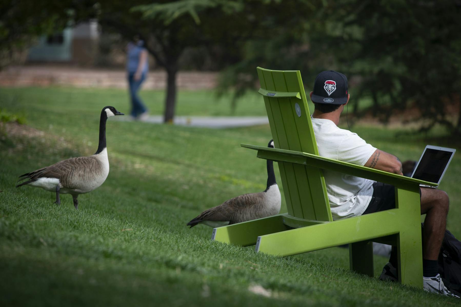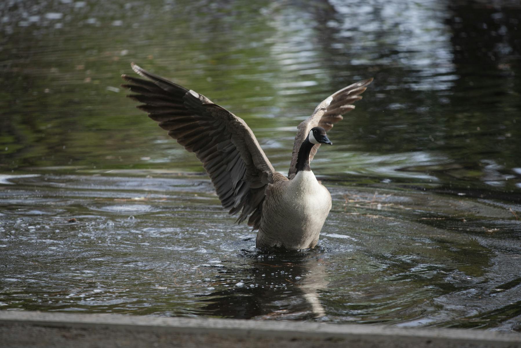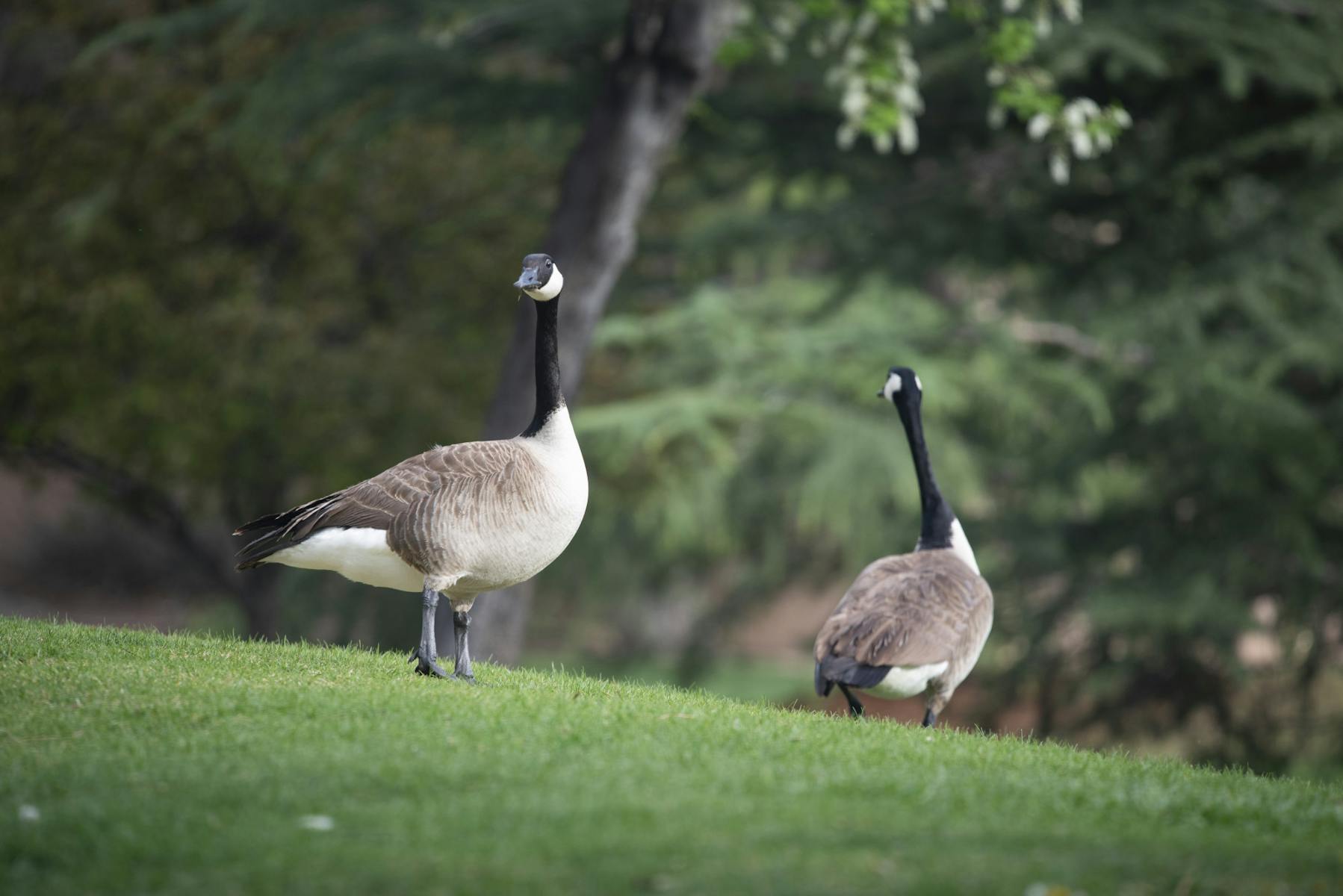 Students quietly studying on the lawn the Duck Pond were briefly interrupted by ruffling feathers and a wholesome gaze from dark and shiny, beady eyes.