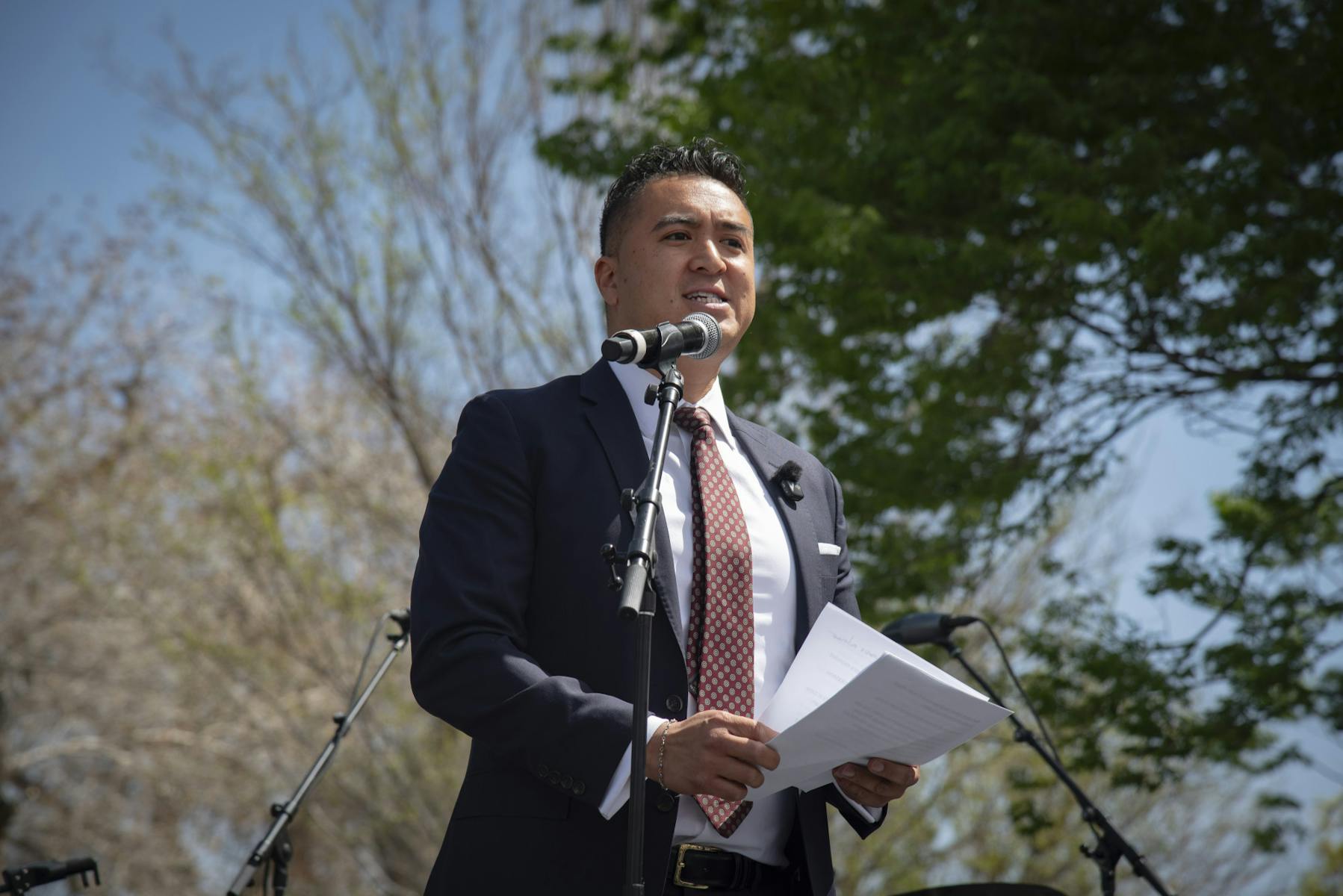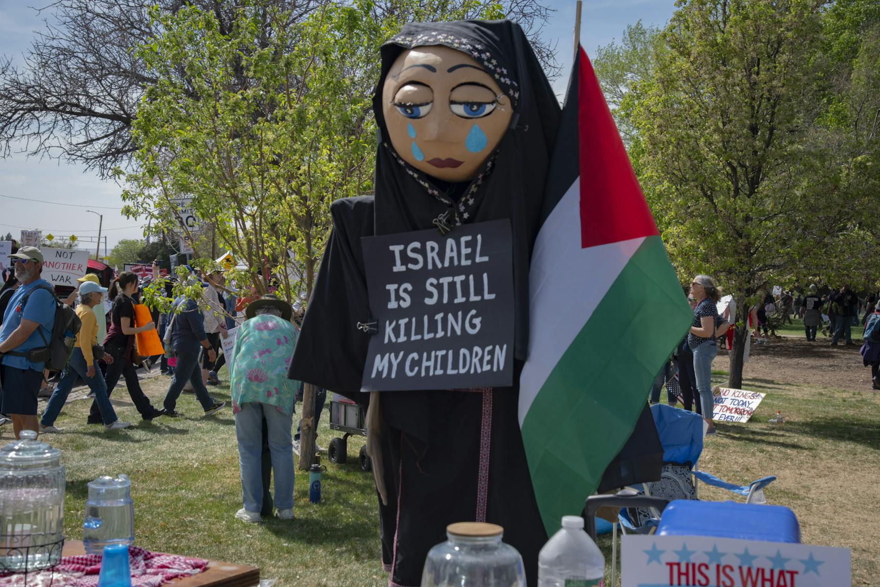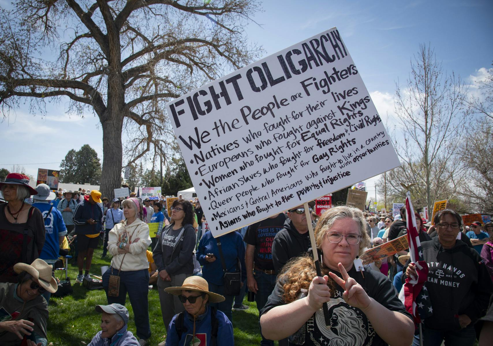 Chants criticizing President Donald Trump, Immigration and Customs Enforcement and the war in Iran echoed throughout the crowd. Some participants highlighted Blackstone’s proposed acquisition of energy supplier Public Service Company New Mexico, chanting “Our home is not a sacrifice zone,” and carrying banners that read “Back off Blackstone."
