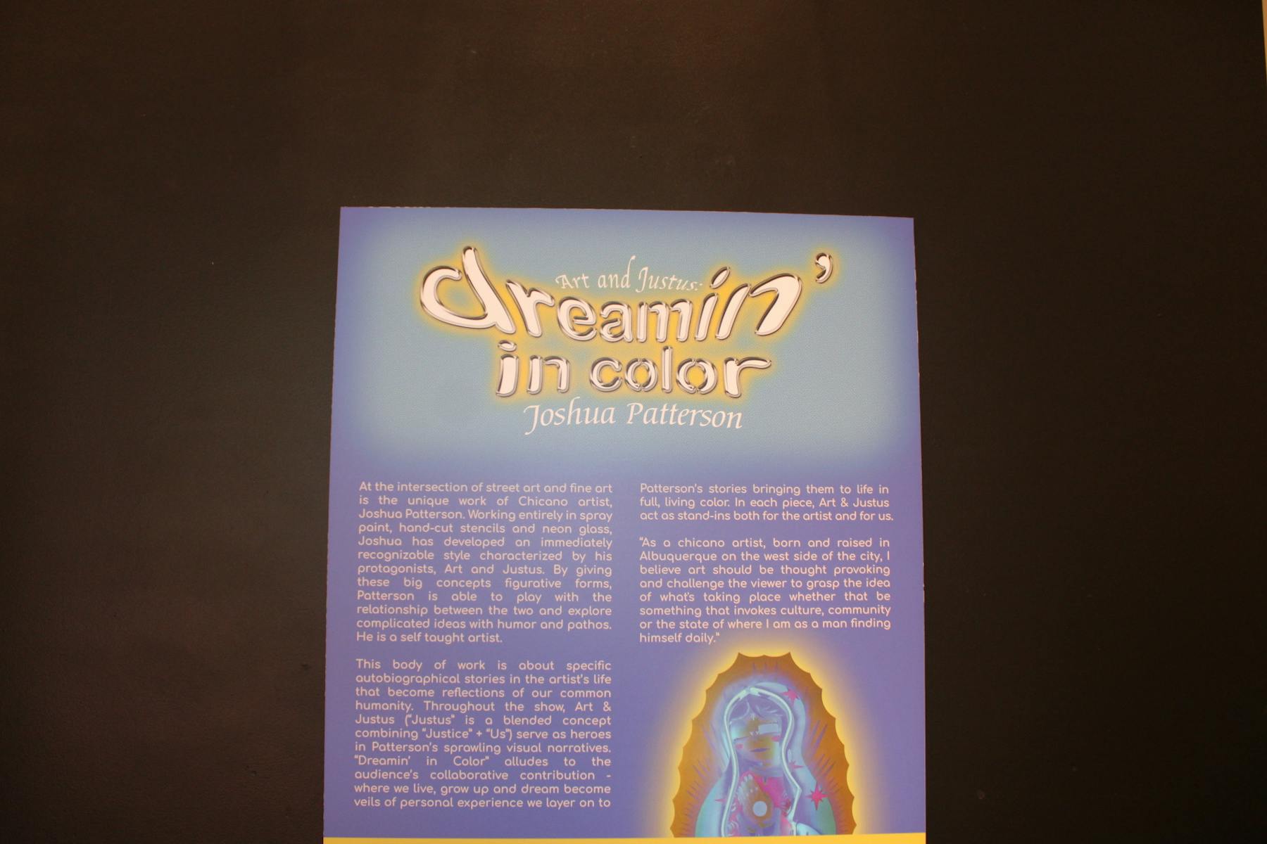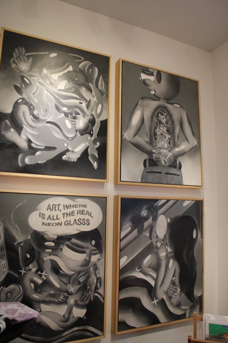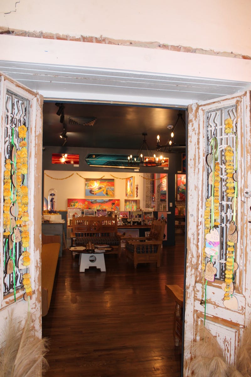 The Lapis Room, connected to the Noisy Water winery in Old Town, has been featuring artwork by local spray paint artist Joshua Patterson. The exhibit “Art and Justus: Dreamin’ in Color,” combines the styles of street art and fine art, as well as depicting imagery tied to Patterson’s Chicano heritage. The artwork reflects stories from Patterson’s life, told through a visual narrative with bright colors and neon lights. The figures “Art” and “Justus” — a combination of the words “justice” and “us” — are depicted throughout most parts of the piece, meant to represent both the artist and viewers as Patterson brings his stories to life.