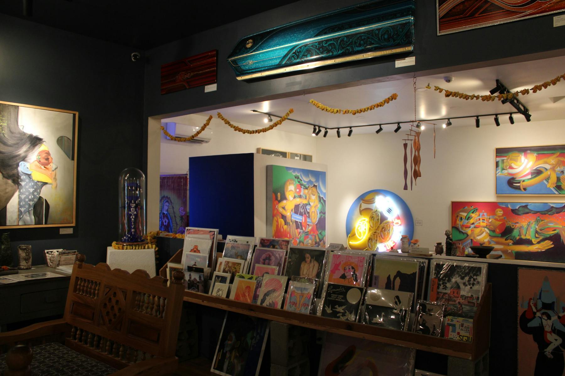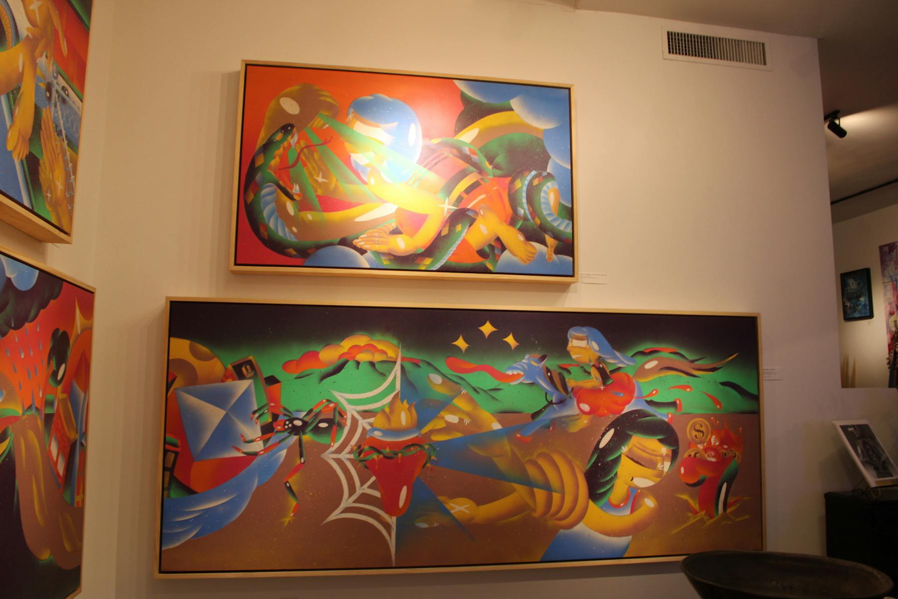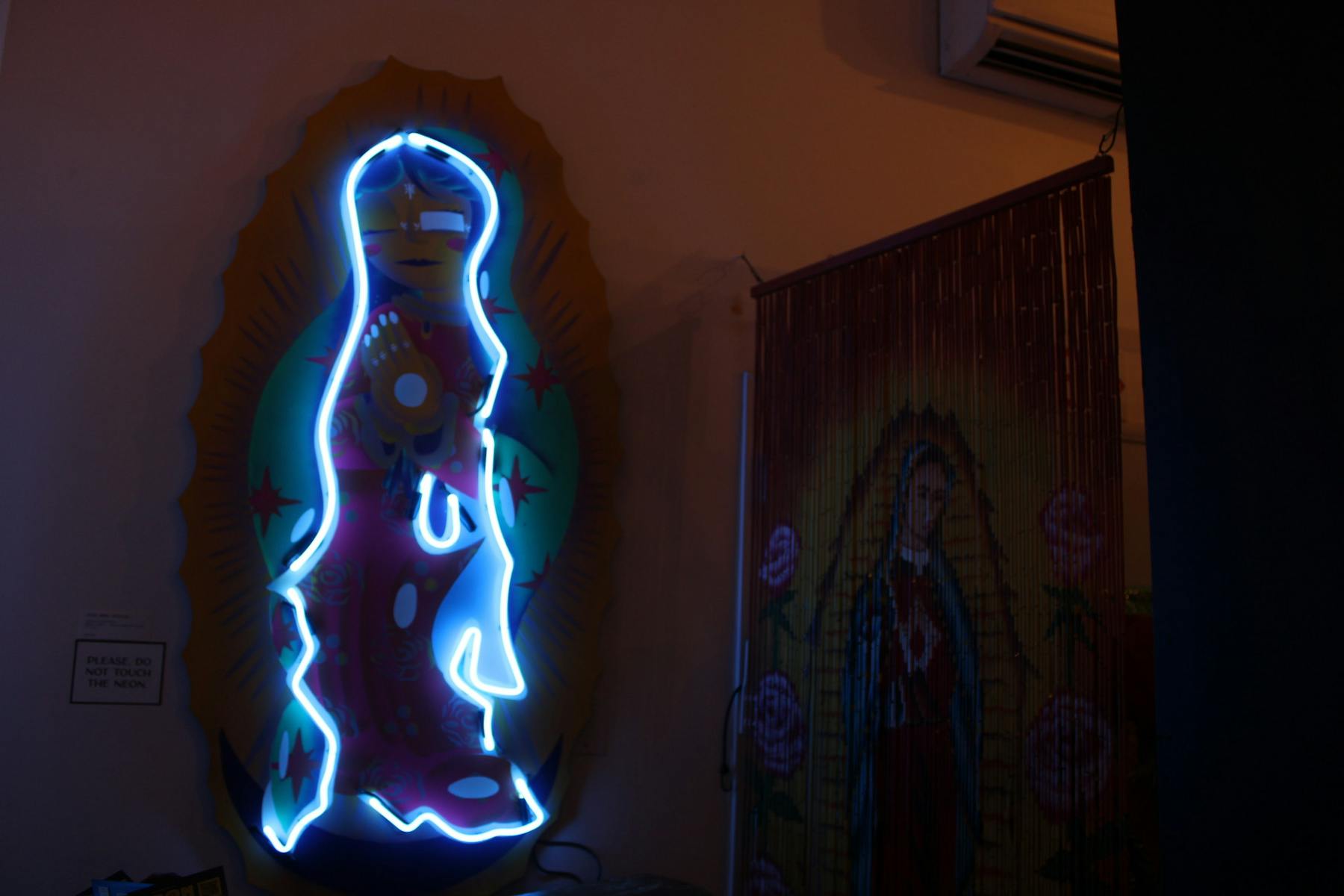 The Lapis Room, connected to the Noisy Water winery in Old Town, has been featuring artwork by local spray paint artist Joshua Patterson. The exhibit “Art and Justus: Dreamin’ in Color,” combines the styles of street art and fine art, as well as depicting imagery tied to Patterson’s Chicano heritage. The artwork reflects stories from Patterson’s life, told through a visual narrative with bright colors and neon lights. The figures “Art” and “Justus” — a combination of the words “justice” and “us” — are depicted throughout most parts of the piece, meant to represent both the artist and viewers as Patterson brings his stories to life.