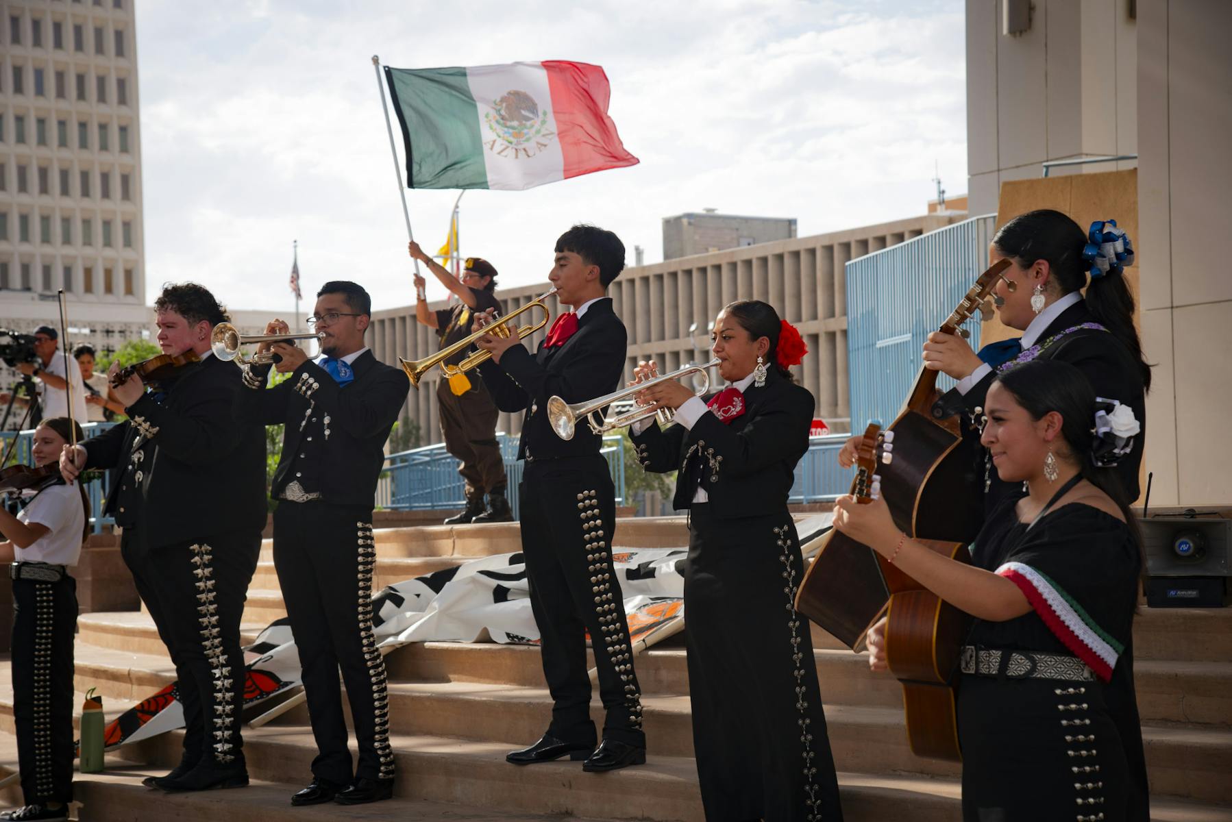 The protest began at Civic Plaza, during which mariachi performers sang and played songs, and organizers gave speeches to the crowd before the march.