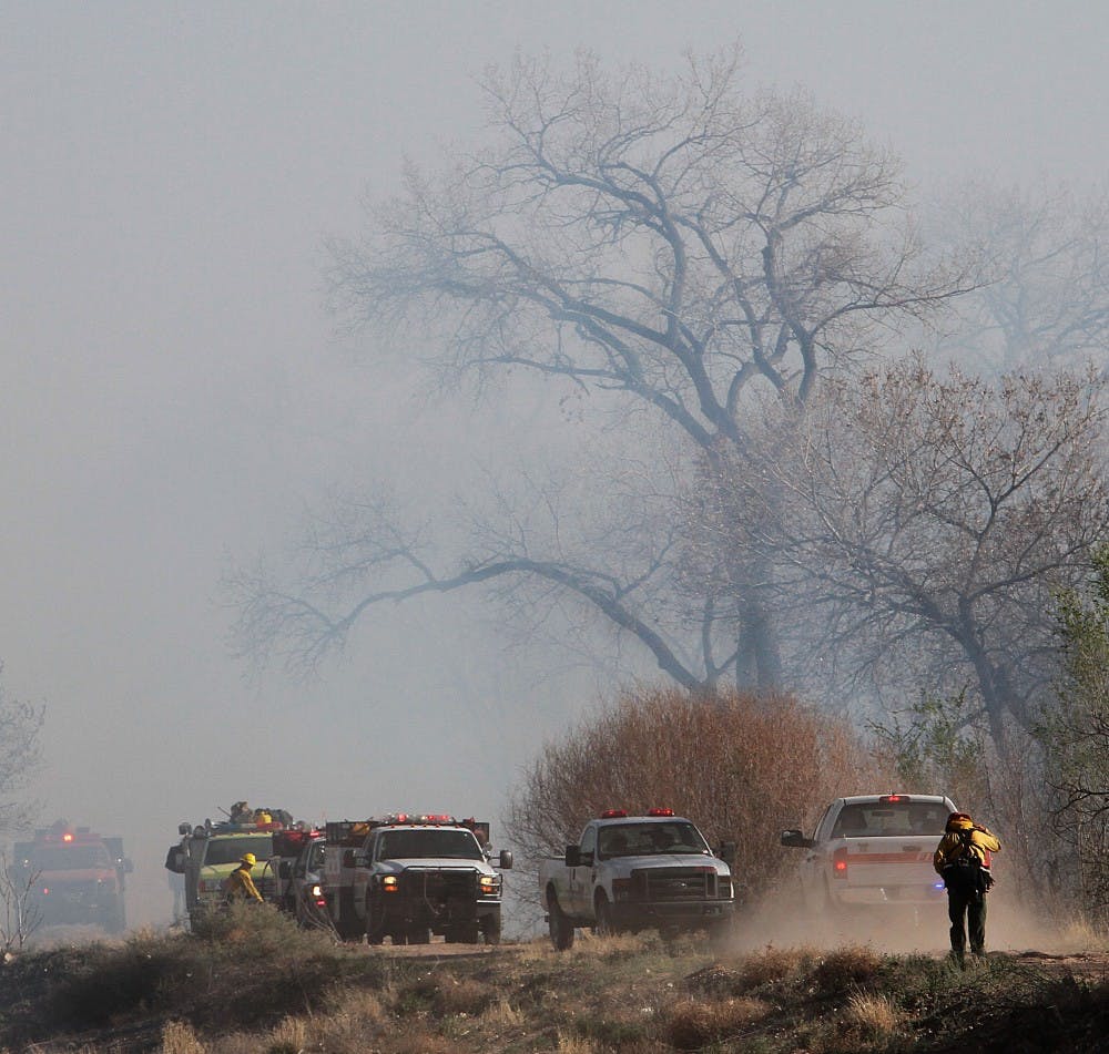 Albuquerque re ghters wave on an envoy of AFD vehicles near the Hispanic Cultural Center on Monday. The Bosque caught re near the center, and smoke could be seen and smelled on campus. As a result, a UNM TextMe alert was sent out warning students with respiratory illnesses to stay indoors.