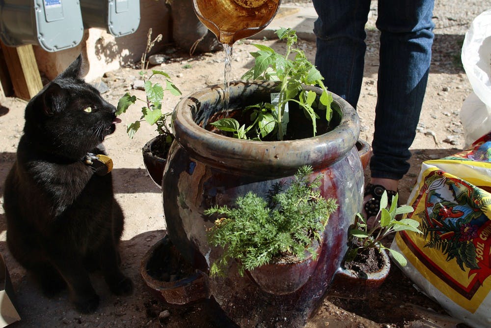 “Beebop” eats catnip from a freshly planted container garden on Wednesday. The Daily Lobo gathered the necessary plants and containers to start a container garden. The whole garden, including the container, cost just less than $80 to pull together.