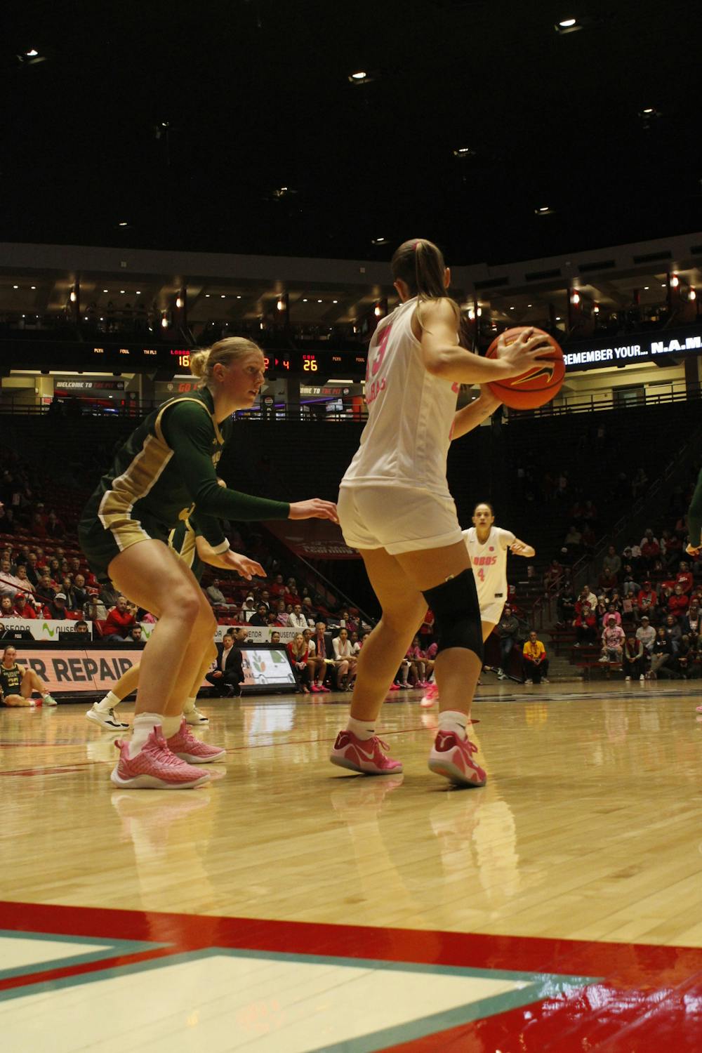 UNM Lobos guard, Joana Magalhães (3), faces off against Colorado State guard Lexus Bargesser during the UNM versus Colorado State at The Pit on Saturday, Feb. 14.
