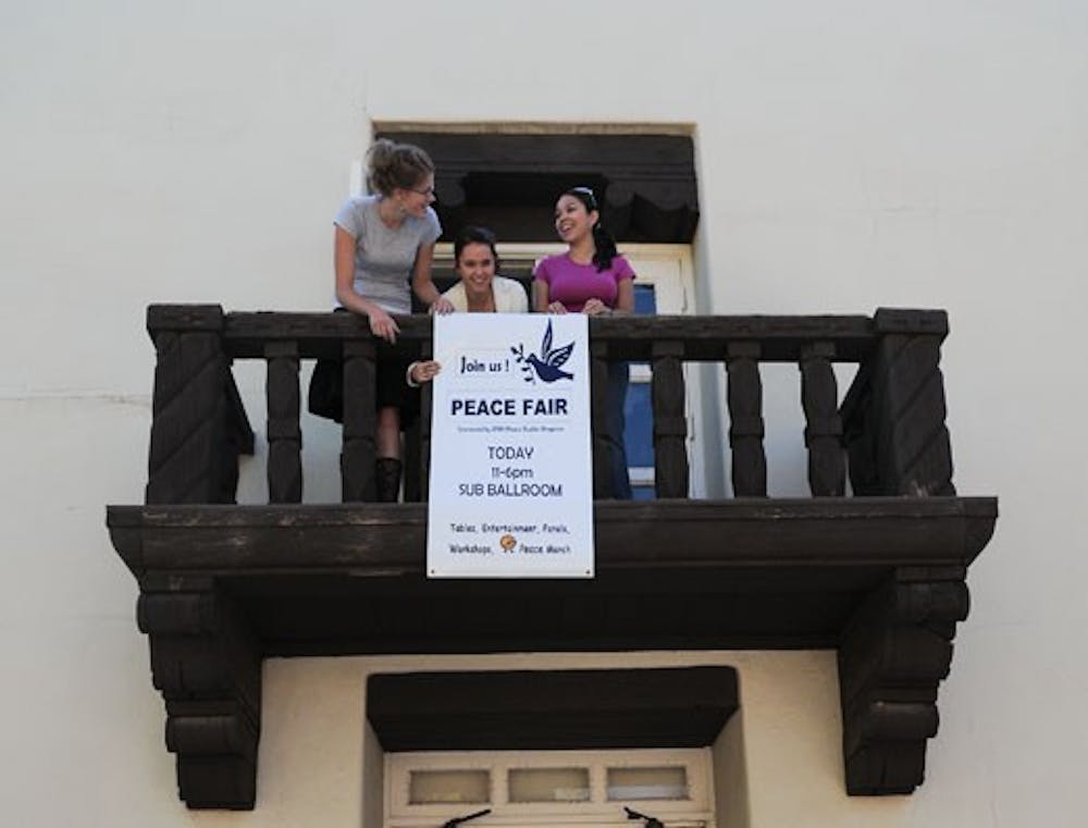 From left: Pavlina Peskova, Camila Mejia and Lisa Galindo help prepare for Wednesday's Peace Fair, which will be in SUB ballrooms A and B.