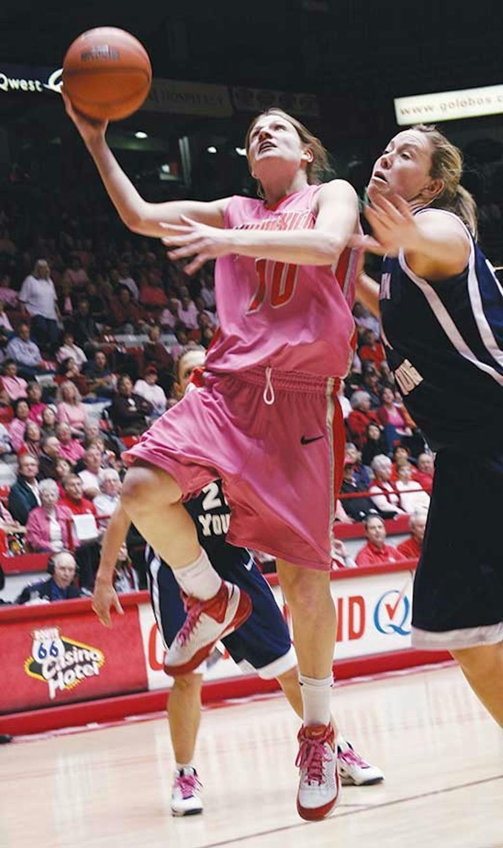 Amy Beggin goes up for a layup over BYU's Cassie King on Tuesday at The Pit. The Lobos cruised to a 52-37 win.