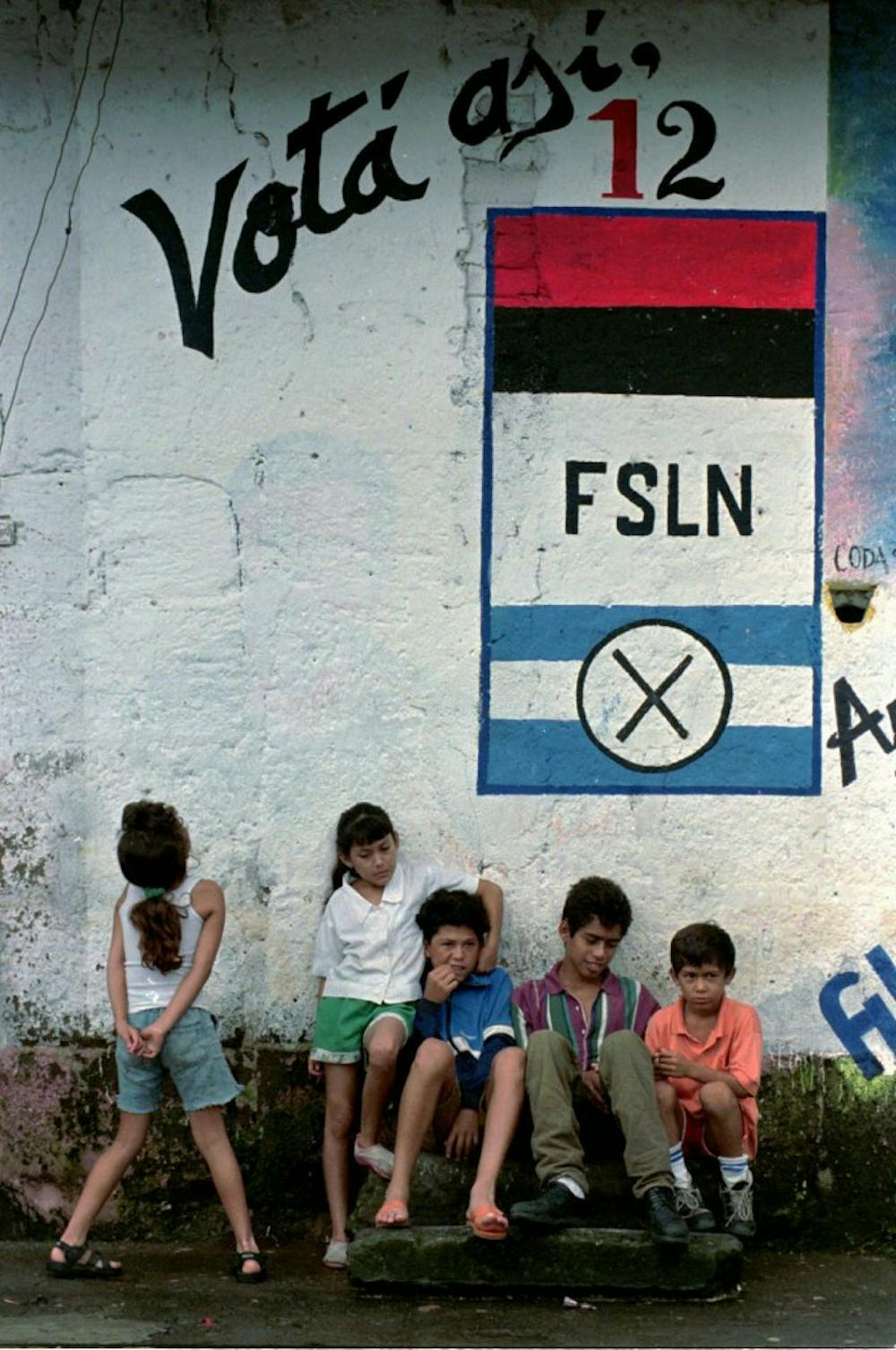 Children sit under a mural calling for Nicaraguans to cast their ballots for candidates with the Sandinista Liberation Front (FSLN) in Jinotepe, some 21 miles south of the Nicaraguan capital of Managua. Nicaraguans who are 16 and over are eligible to vote in Sunday's national elections. Former President Daniel Ortega, who governed the nation in the 1980's, is the presidential candidate for the FSLN. (AP Photo/Anita Baca)