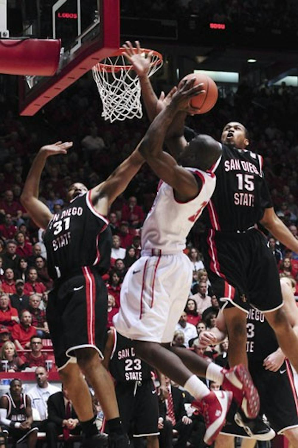 Tony Danridge double clutches a fadeaway jumper over SDSU's Lorrenzo Wade, left, and Kyle Spain. Danridge had 25 points in the Lobos' 75-49 victory Saturday at The Pit.