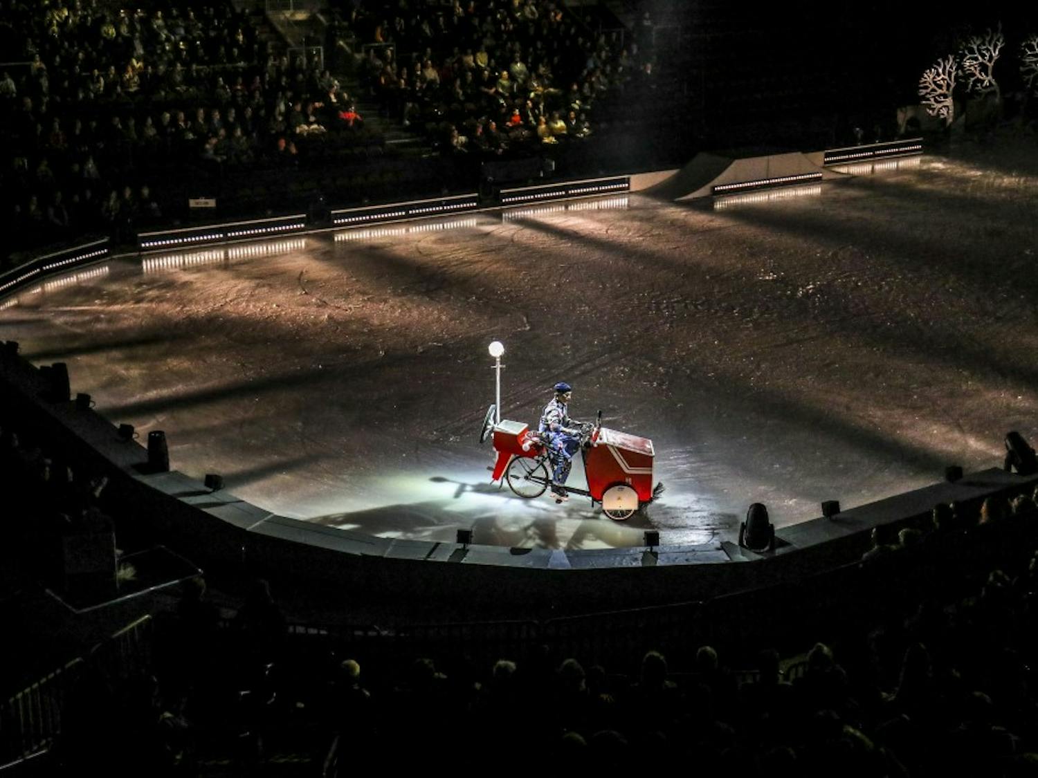 A Cirques Du Soleil performer swings on the trapeze during their show ?Crystal, A Breakthrough Ice Experience? at the Santa Ana Star Center on Feb. 7, 2018.