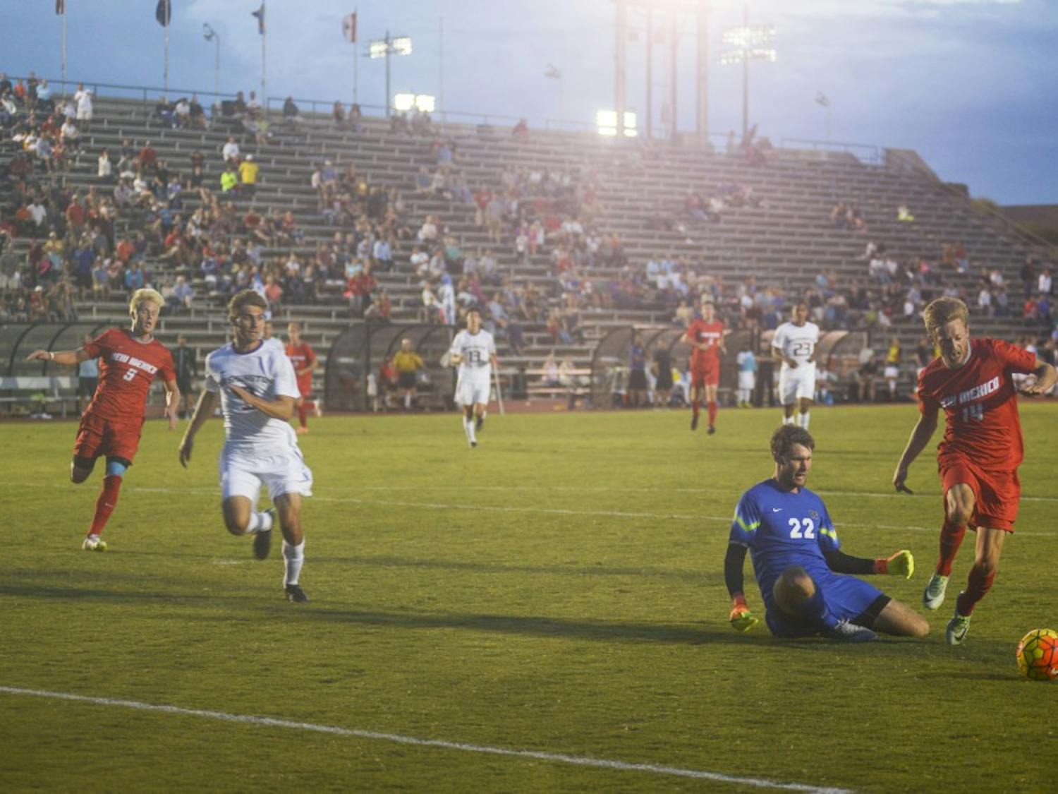 Redshirt senior midfielder Chris Wehan attempts to slide tackle a Washington University player Saturday, August 20, 2016 at the UNM Soccer Complex. The Lobos will play CSU Northridge this Saturday.